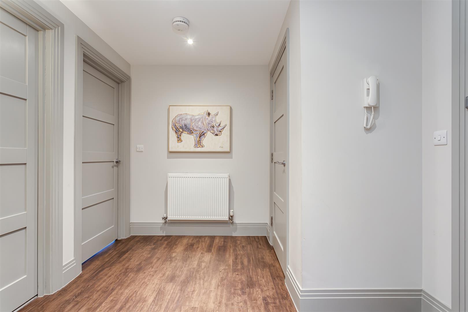 Downlighters. Entry phone system. Radiator. Storage cupboard housing meters, fuse board, boiler and ample storage. Hardwood veneers engineered flooring.