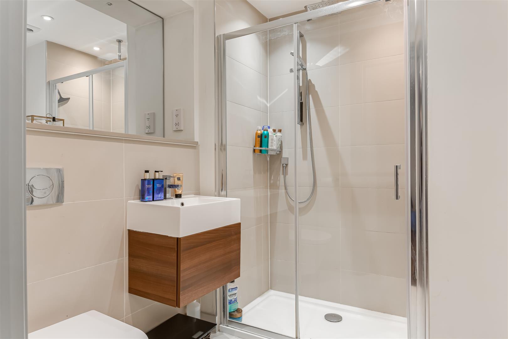 Walk in shower cubicle with rain shower and hand held shower. Low level WC with concealed cistern. Wall mounted wash hand basin with storage below. Shaver point. Mirror. Downlighters. Extractor fan. Tiled floors. Heated towel rail.