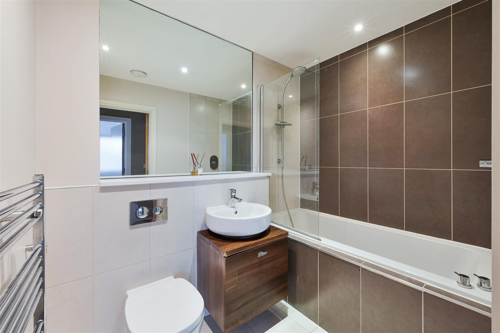 White suite with a panelled bath with wall mounted shower above and a glass shower screen. Wash hand basin with mixer tap and vanity cupboard below, low level wc with concealed system, mirror, shaver point, downlighters, heated towel rail, part tiled walls, tiled floor and ceiling mounted extractor.