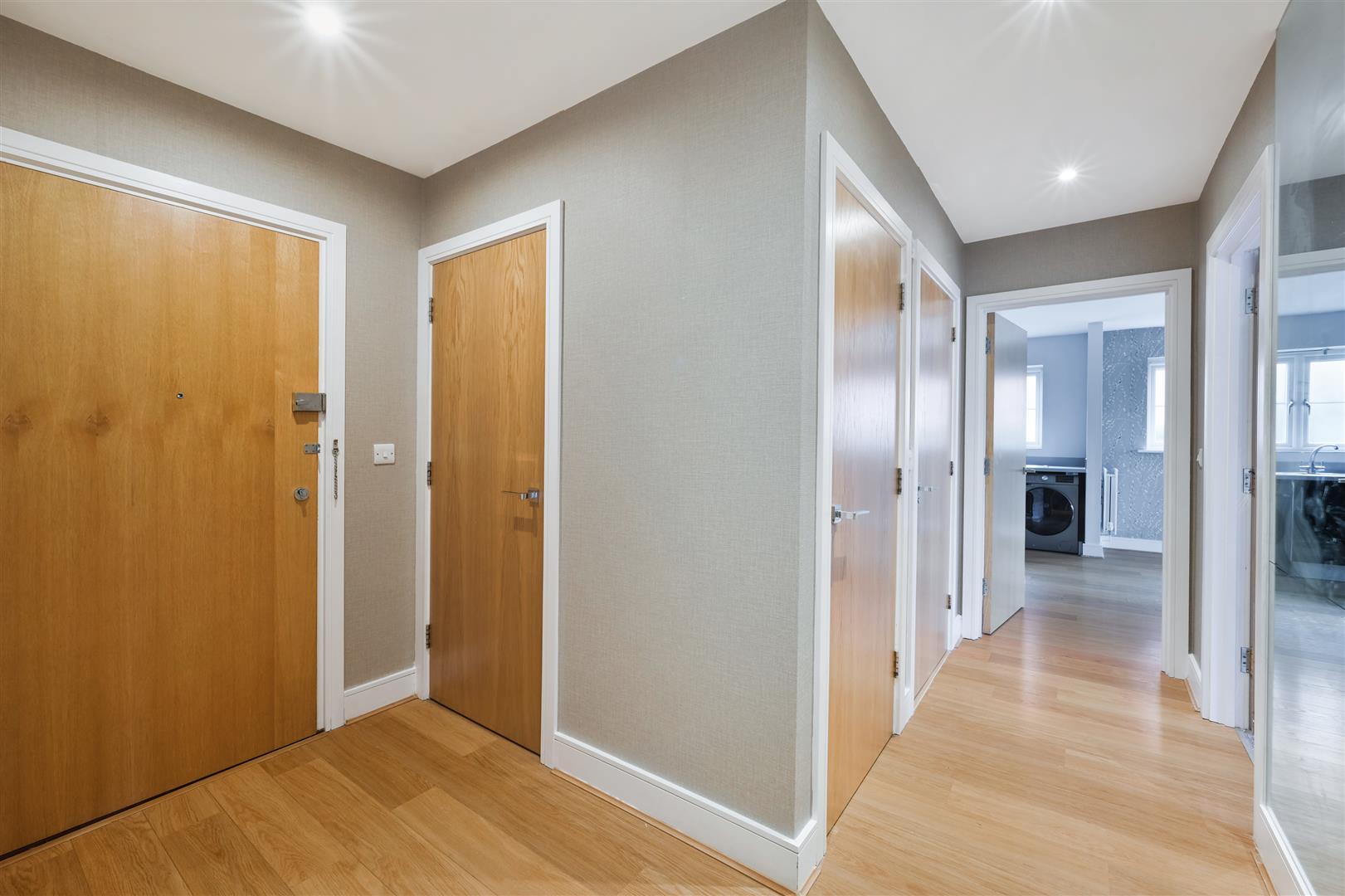 Radiator, wooden flooring, cupboard housing insulated cylinder, downlighters, mirrored wall, further cloaks cupboard and doorway providing access to: