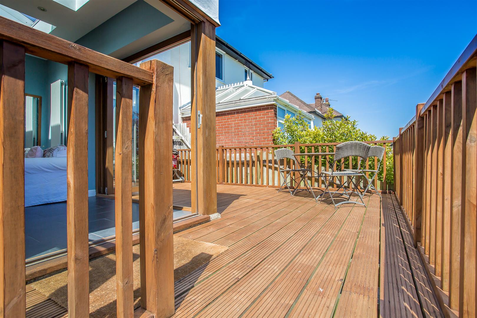Large elevated decking area to provide scenic views and a good-sized grass area and border flower-beds. In all extending to 90 feet