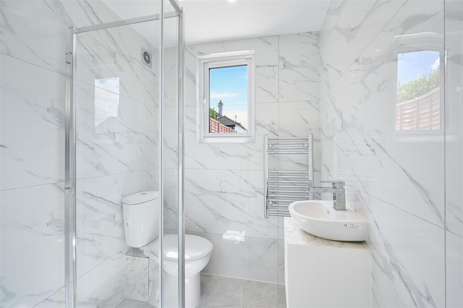 Shower en-suite to bedroom one with WC, basin and heated towel rail