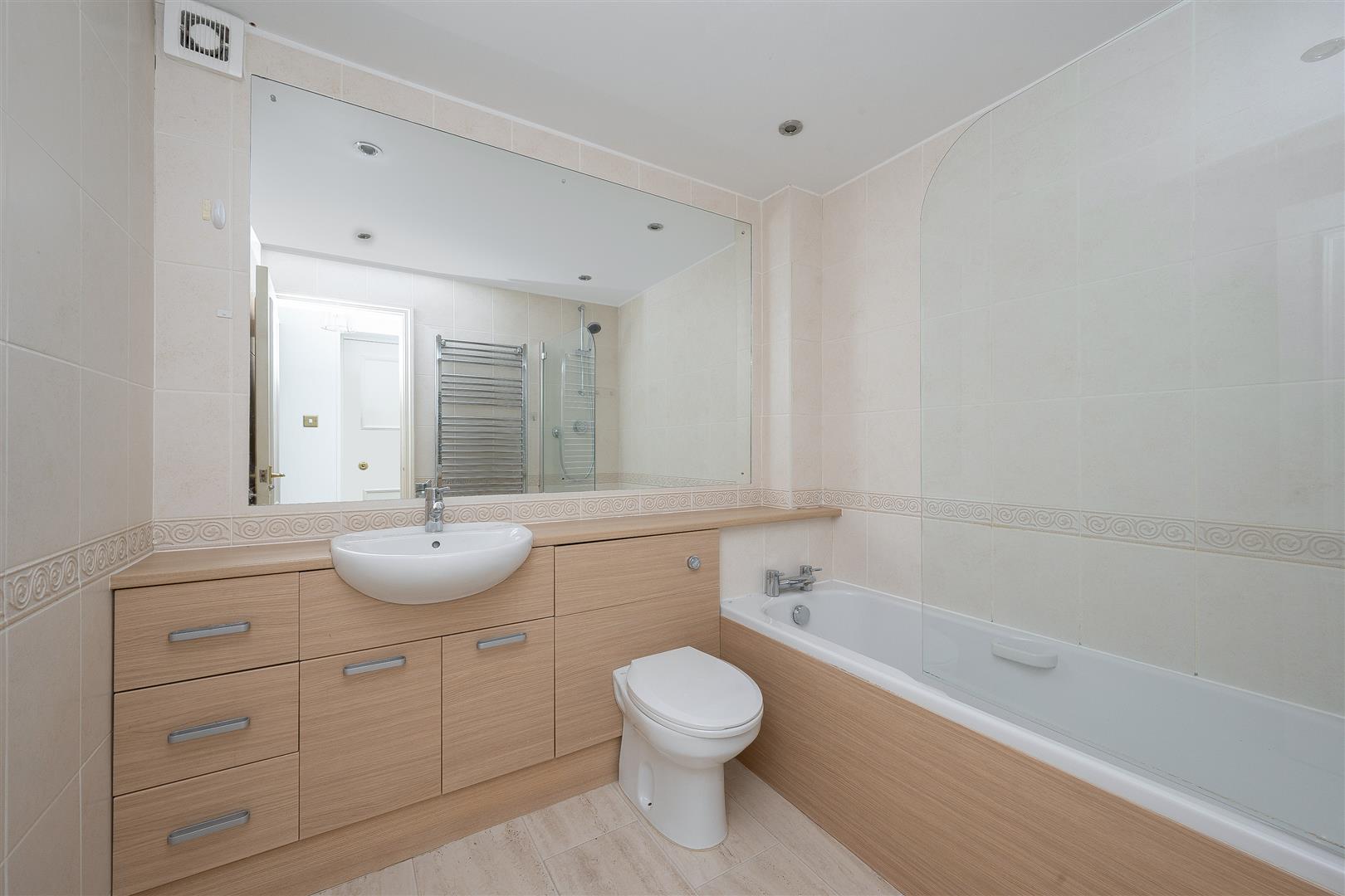 Comprising of a white suite with a panelled bath with mixer tap. There is an independent shower above and glass shower screen. Low level wc with concealed cistern. Wash hand basin with mixer tap and vanity cupboards and drawers. Mirror. Wall mounted extractor, downlighters, fully tiled walls, tile effect flooring and heated towel rail.