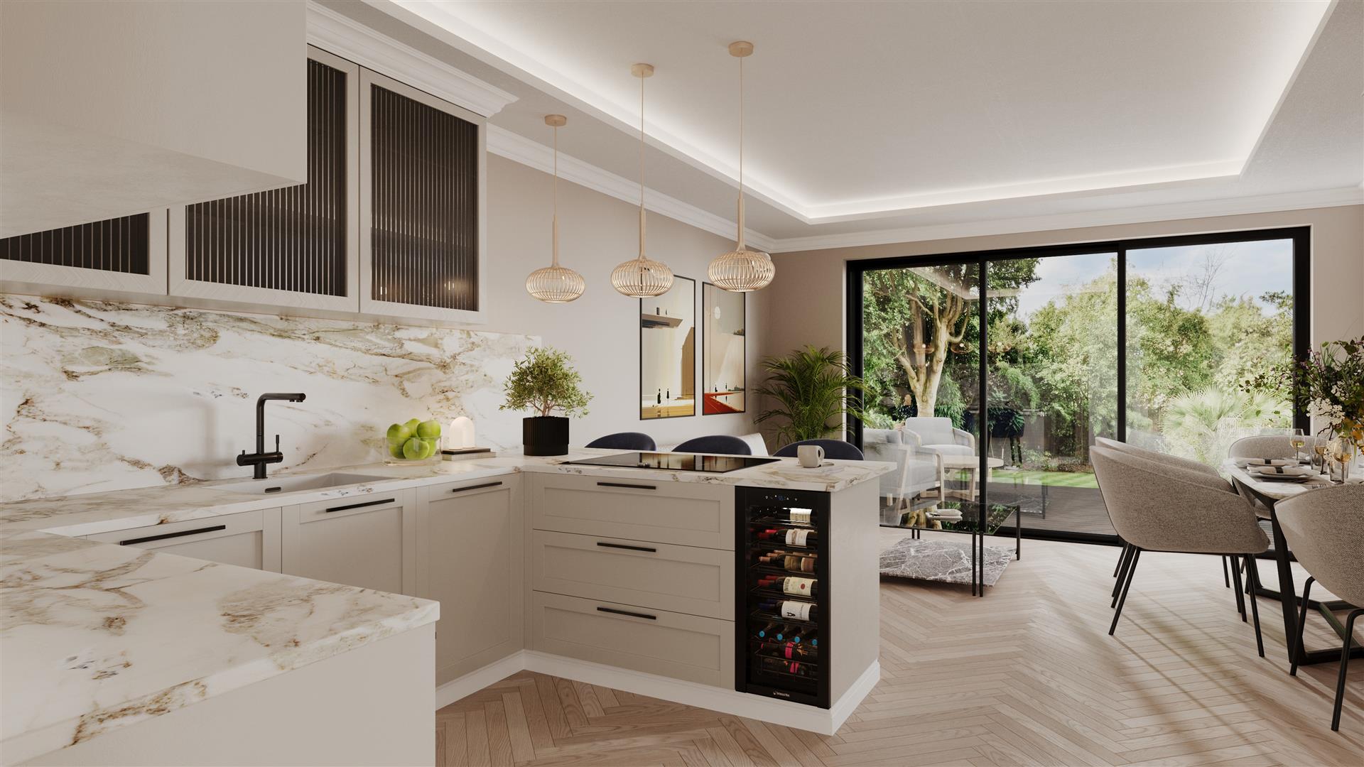 In-frame grained shaker kitchen with solid Treviso quartz worktops and undermount lighting