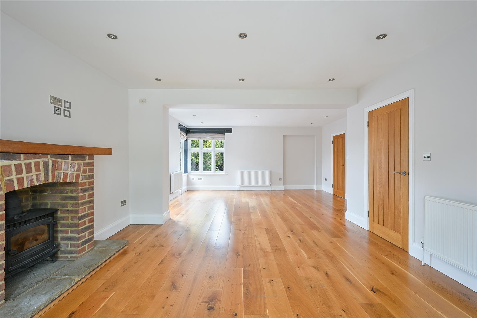 Double size room with feature brick fireplace and bay window to the front with additional corner window