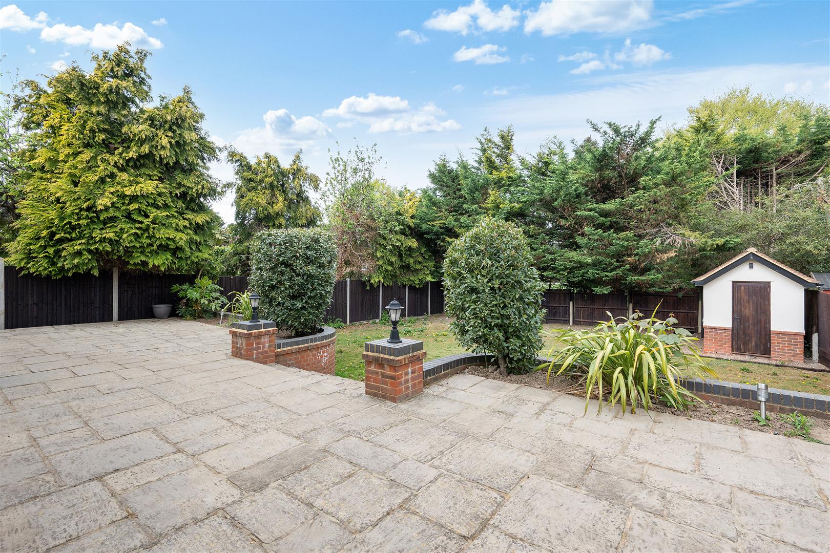 Large garden laid mainly to grass with good size patio area and separate storage shed