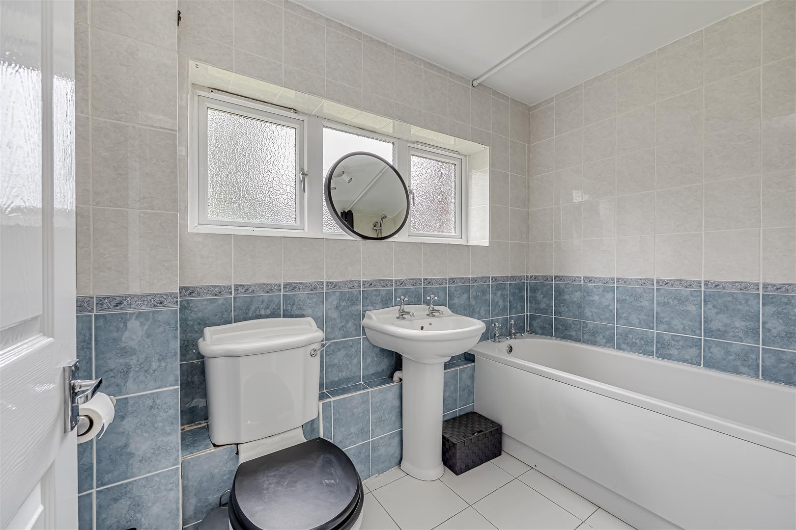 Bath with overhead shower. Low level WC. Wash hand basin.