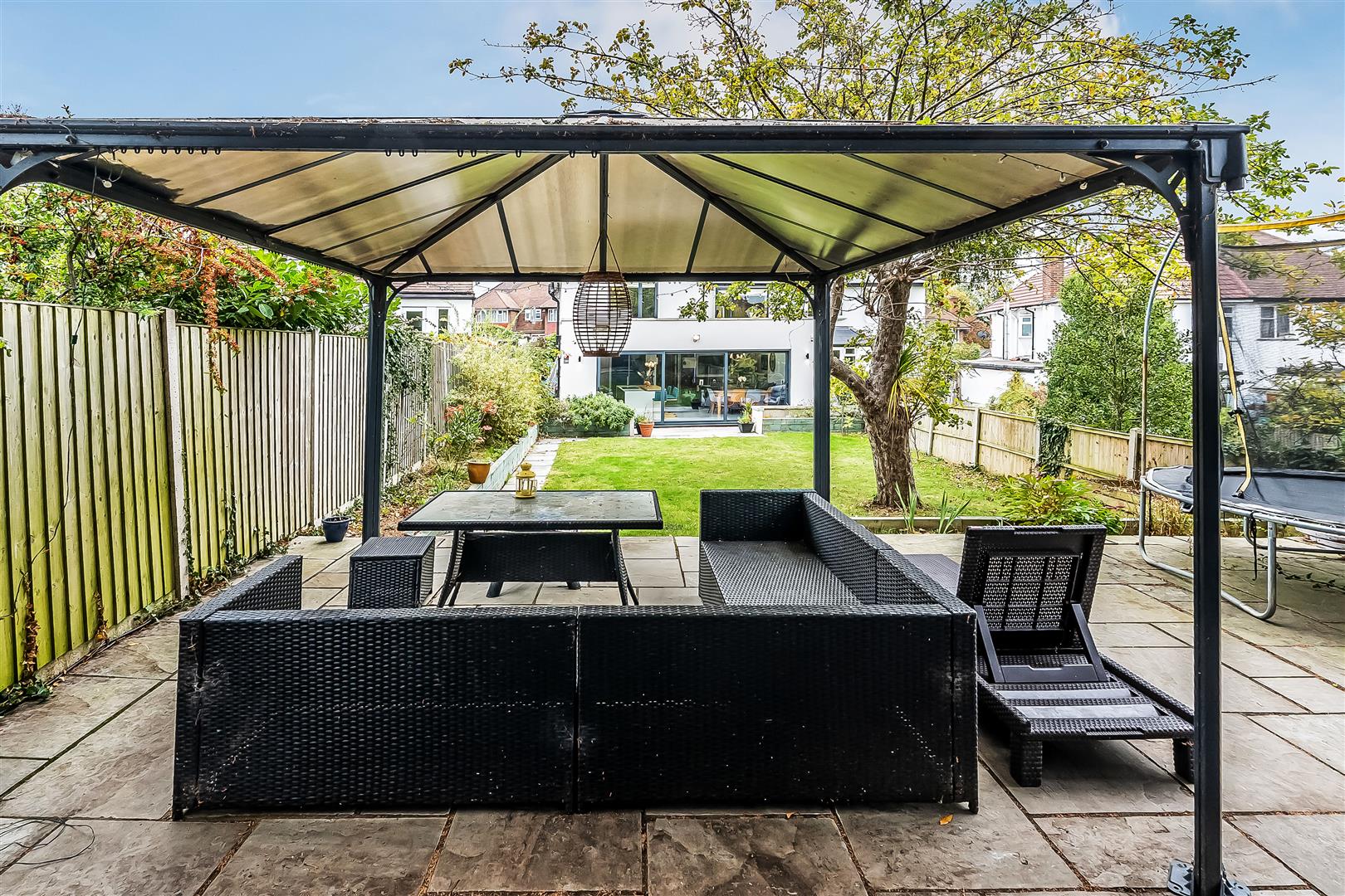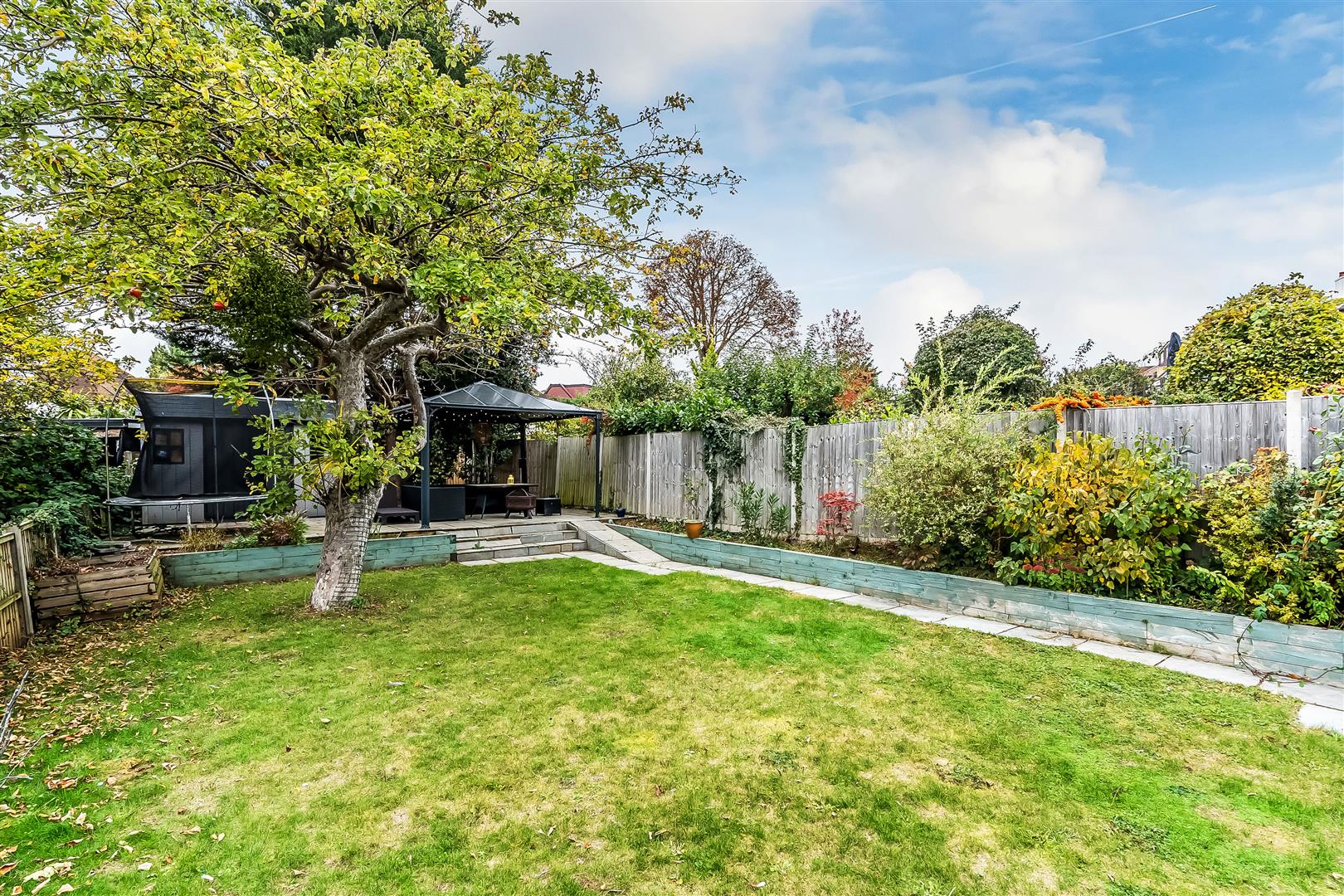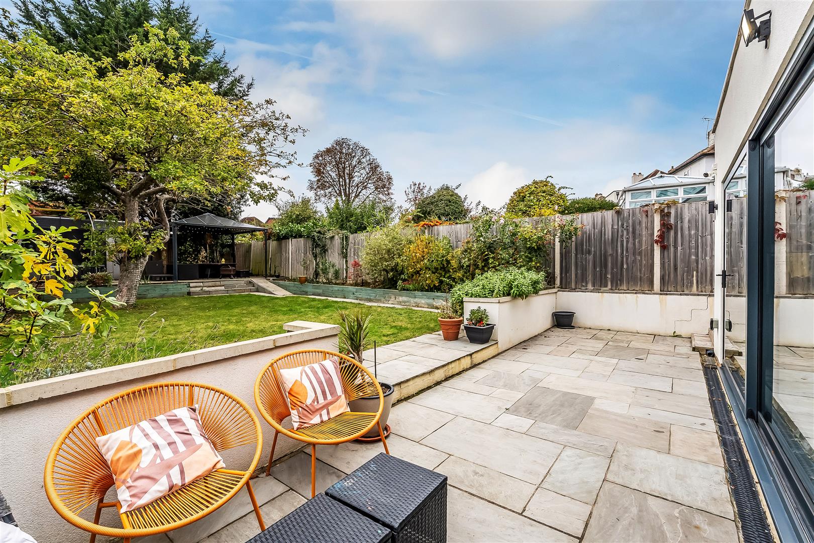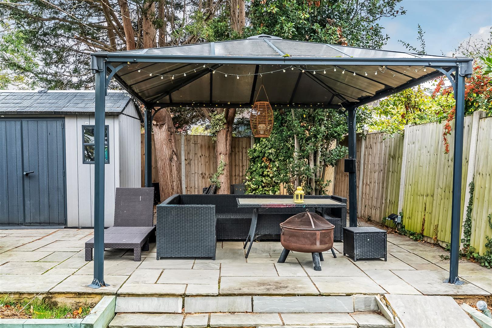 A west facing private rear garden measuring 75 ft. An upper and lower patio frames the lawn and provides hard standing for normal garden equipment. The frontage includes a large block paved driveway for multiple cars.
