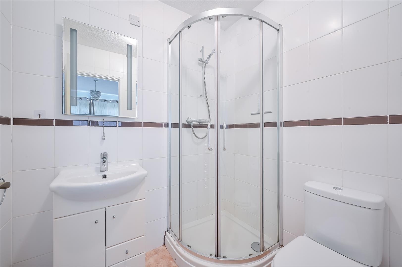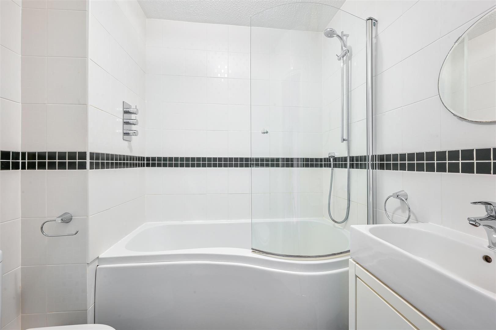 Family bathroom with shower over bath, WC and hand basin with heated towel rail