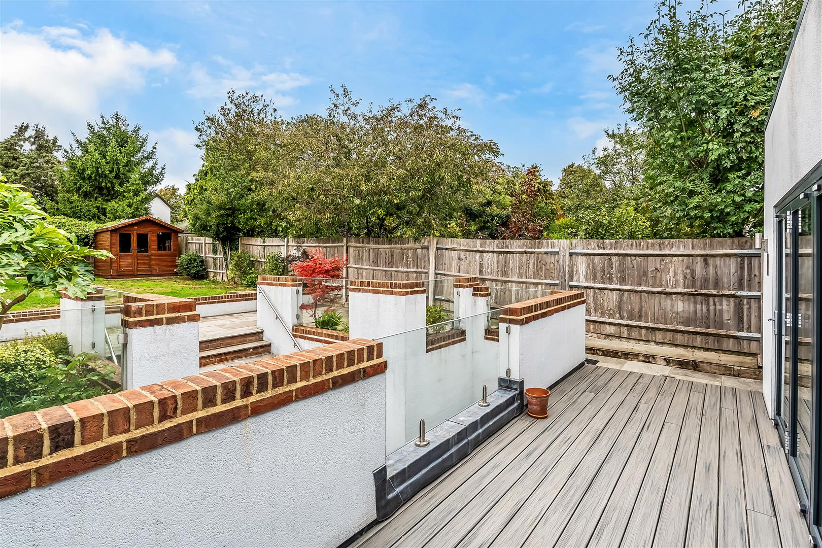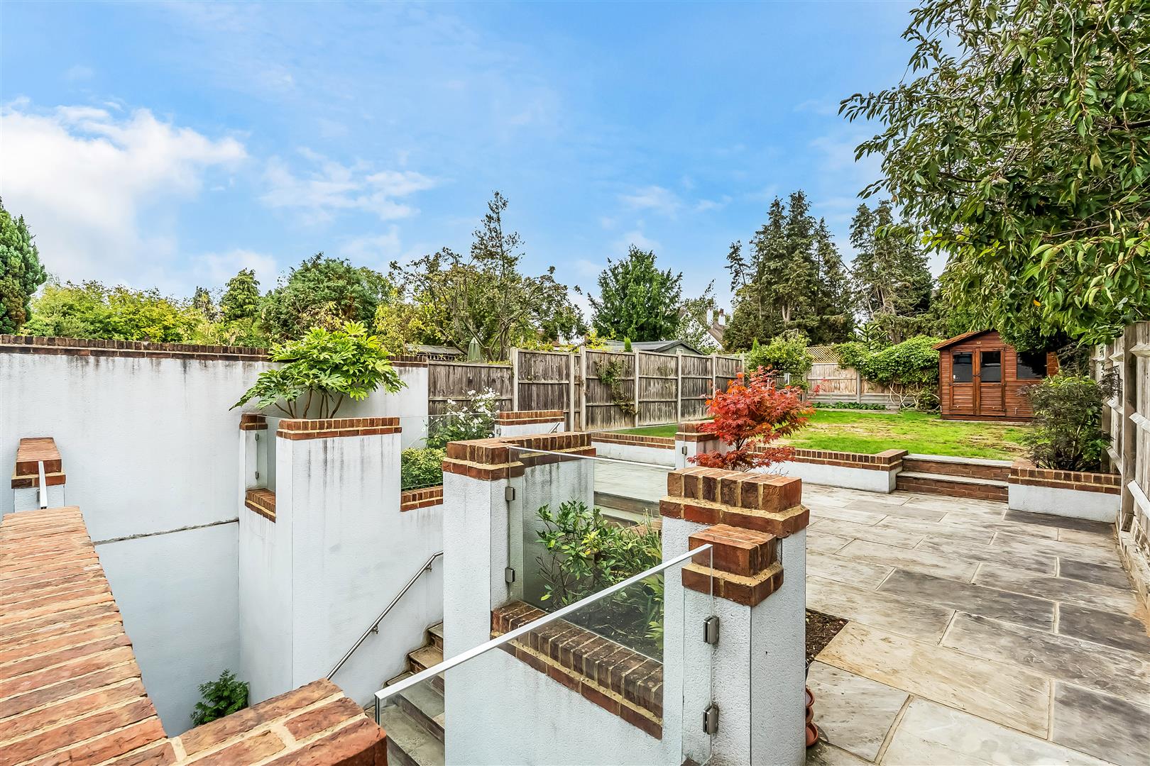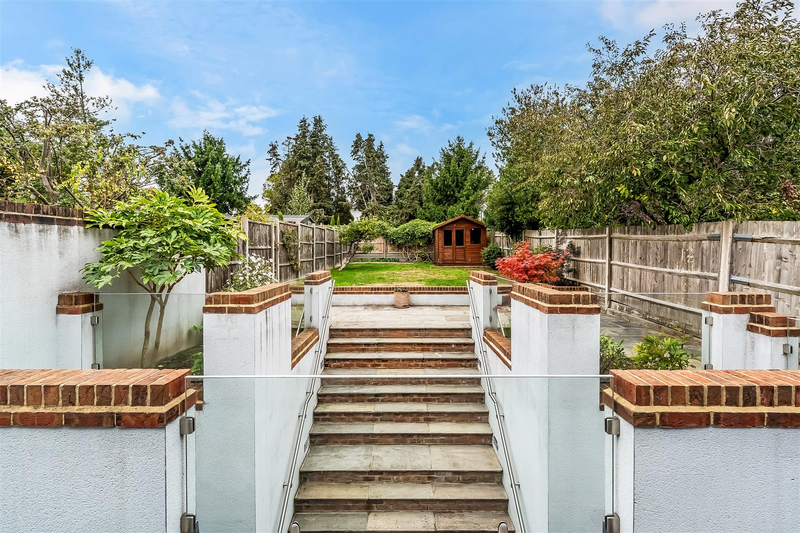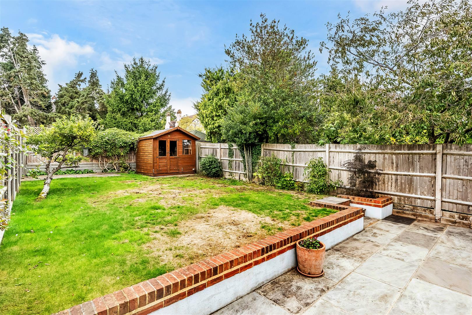 Westerly rear garden measuring 74ft comprising of patio, lawn and hard standing for shed. Handsome steps lead down to the basement level. The frontage is particularly handsome and includes a large driveway.