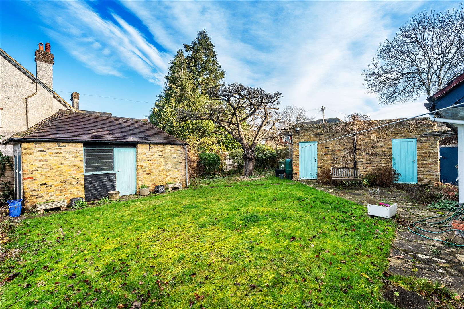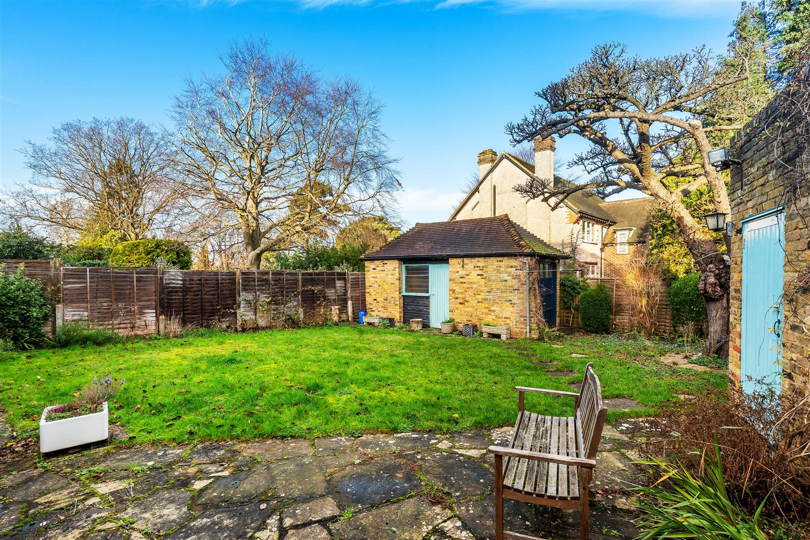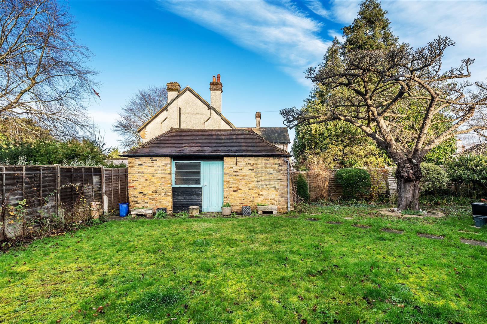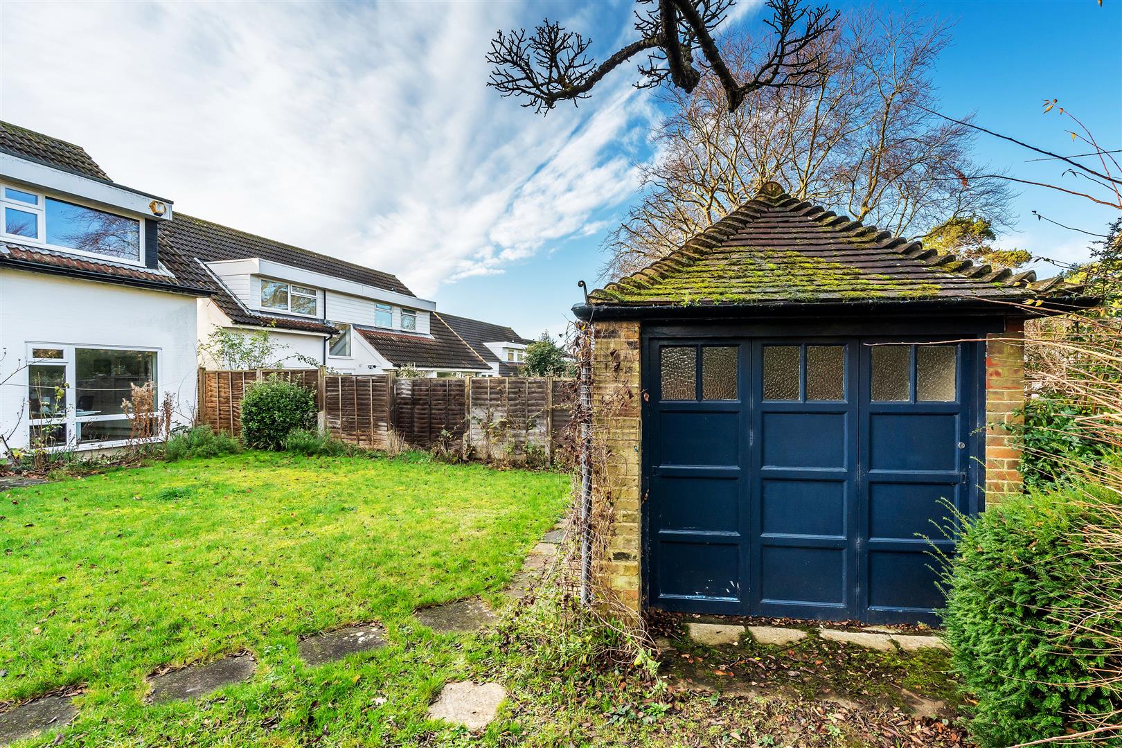 The property benefits from a large double garage and a further outbuilding with the potential to be a home office or man cave. The back garden is private and pretty, providing enough space without being burdensome. A small patio area leads onto the rear lawn. The garden measures 80 feet by 45 feet. The front of the house is 64 feet from the kerb and is landscaped with grassy banks and mature plantings.